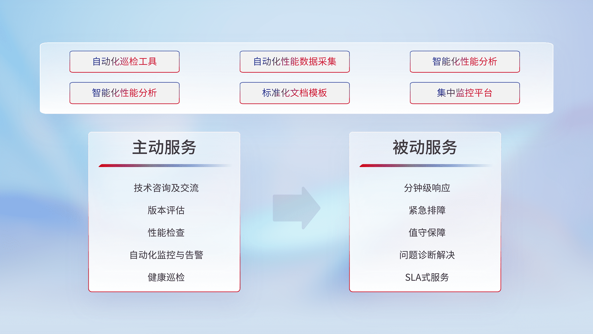 智能化工具和标准化文档,,保障服务质量,,提供主动服务(包含技术咨询、、、、版本评估、、性能检查、、自动化监控与告警、、、、健康巡检)和被动服务包含(分钟级响应、、、紧急排障、、值守保障、、、问题诊断解决、、、、SLA服务)。。。。